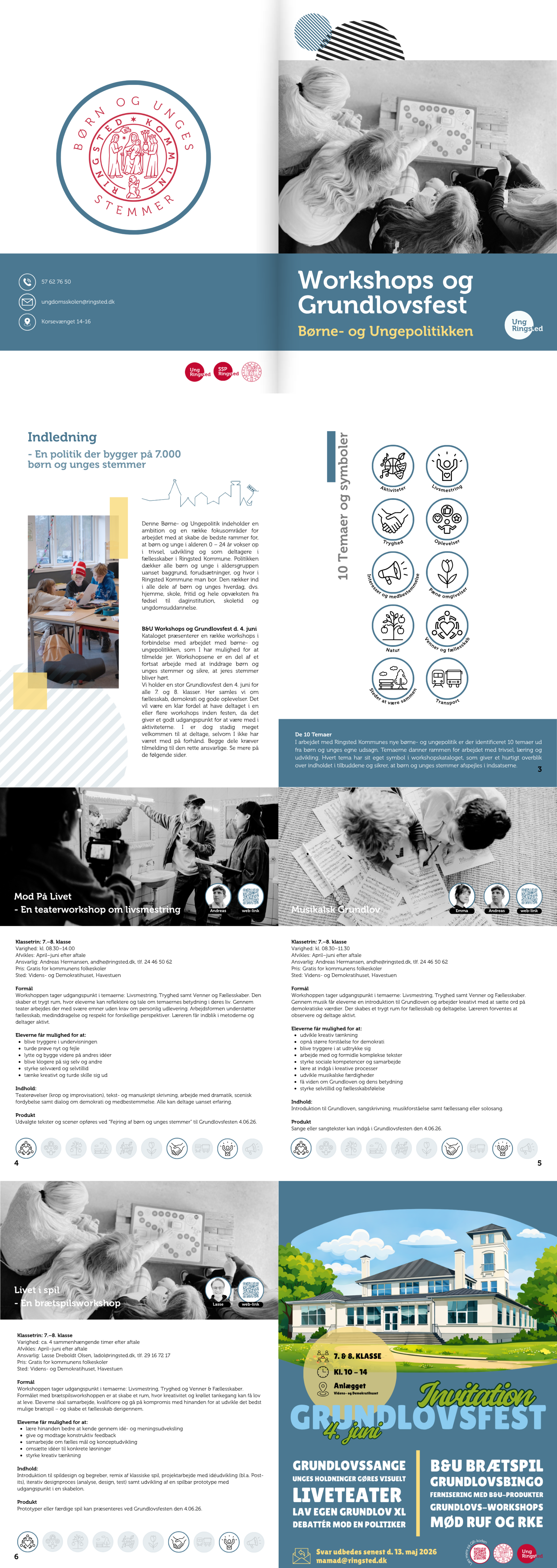 Workshopsene er en del af det forberedende arbejde op til Grundlovsfesten. Her har I mulighed for at arbejde med emner, som I senere kan tage med ind i dagens aktiviteter. Det er en fordel at have deltaget i en eller flere workshops, men det er ikke et krav for at være med.